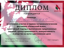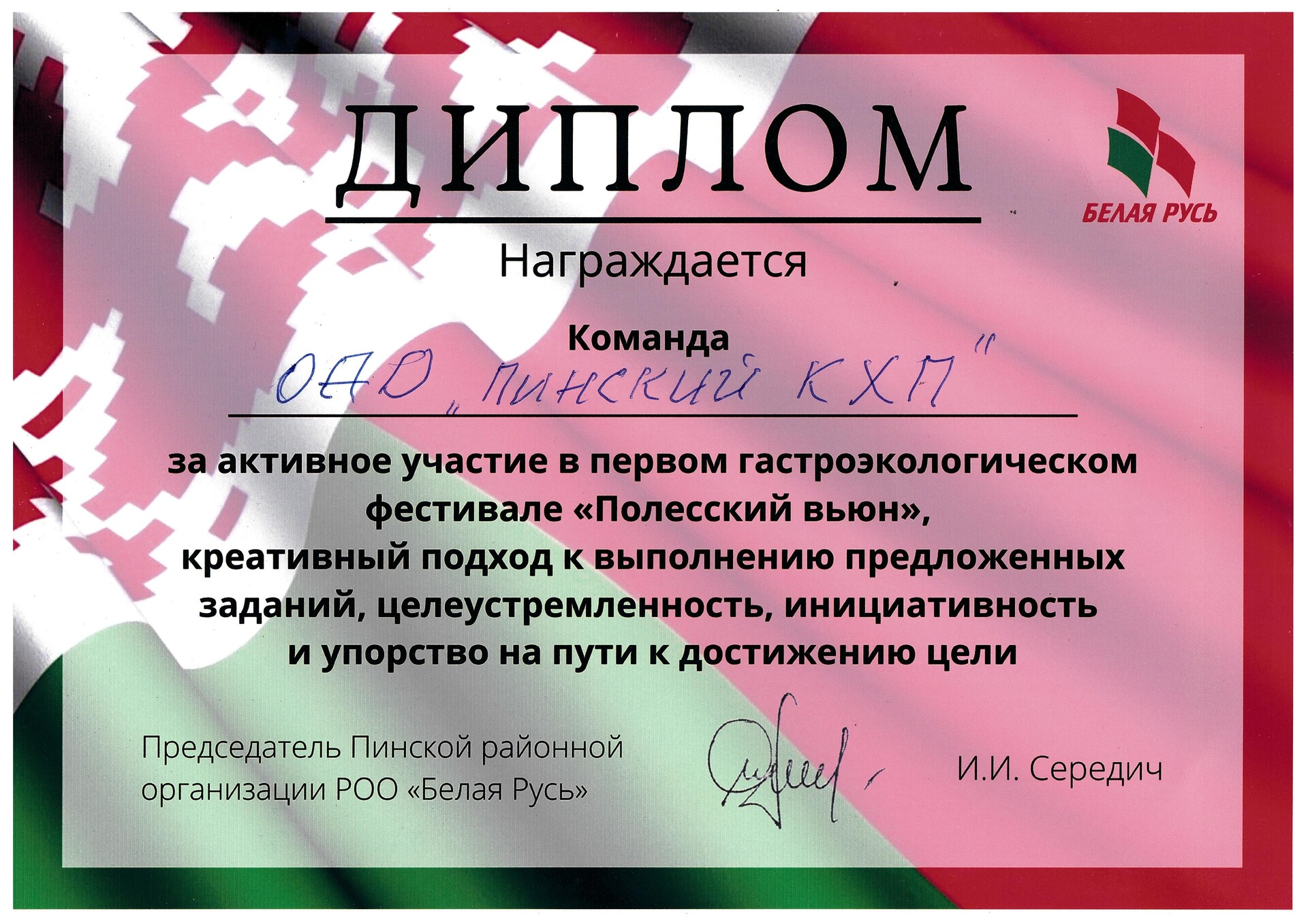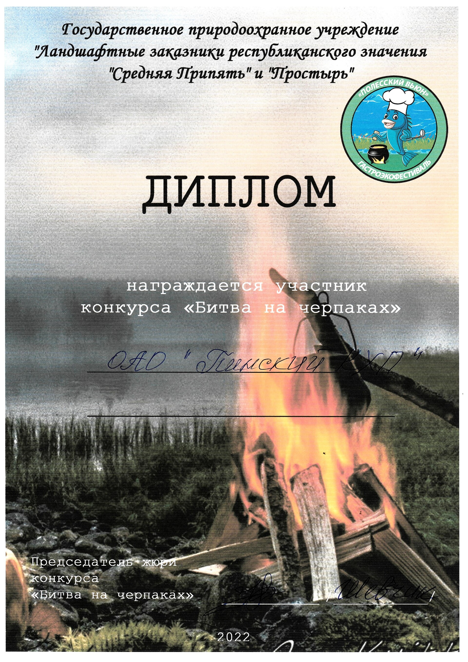 Коллектив ОАО “Пинский комбинат хлебопродуктов” принял активное участие в первом в Пинском районе гастроэкологическом фестивале “Полесский вьюн”, который проходил на берегу озера в д. Городище. Команда предприятия успешно выступила в соревнованиях по приготовлению ухи “Битва на черпаках”, что подтверждено дипломами и наградами.